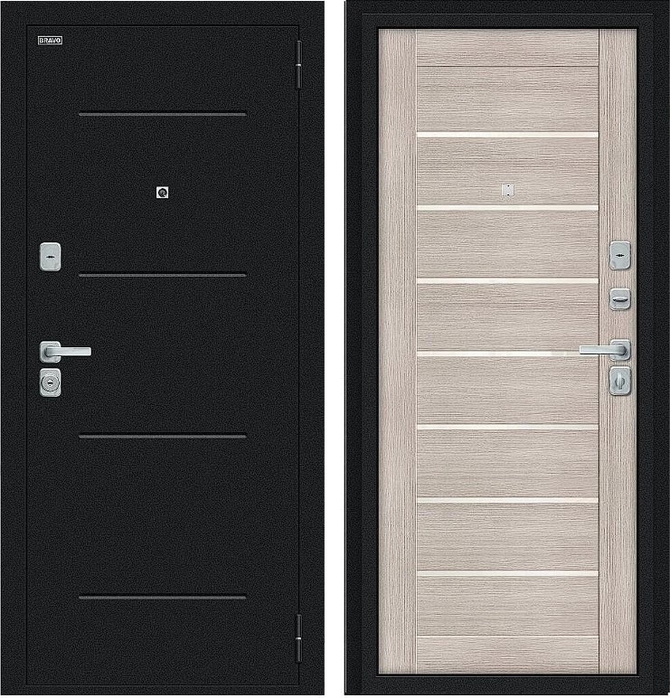 Надежная входная Дверь Браво Техно/BChrome Букле черное/Cappuccino Melinga премиум класса по цене 34 507 руб. Большая толщина стали защитит от проникновения в ваш дом, квартиру или коттедж. Используется очень качественная фурнитура: замки, цилиндры, ручки, защелки. Покрытие и отделка двери изготовлено под внимательным контролем производителя. Дверь имеет долгий срок службы и гарантию.